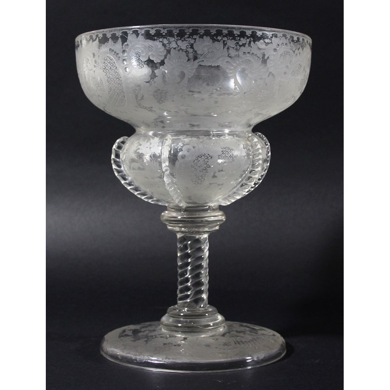 19th century, the two tiered bowl with pinched strapwork, engraved and polished decoration, twisting stem and slightly domed foot with engraved decoration, height 22cm