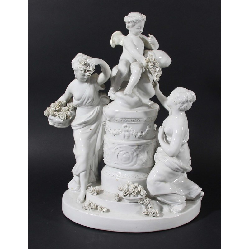NAPLES PORCELAIN CENTREPIECE, of two cherubs and two maidens around a column, in white, signed 'Boczat', blue N beneath a crown, height 33cm