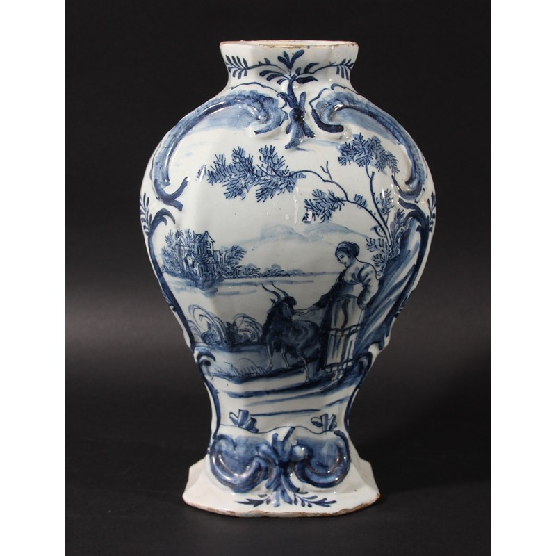 DUTCH DELFT VASE, late 18th century, blue painted with a classical lady with a goat, blue 6 or 9 to the base, height 27cm