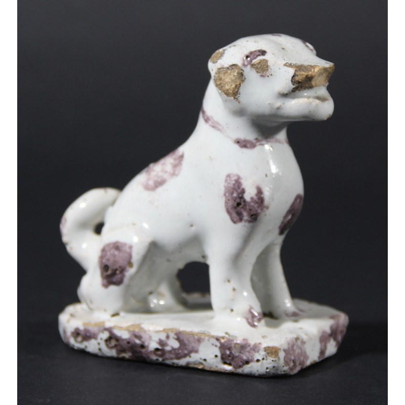 DELFT FIGURE OF A DOG, probably Dutch, late 18th century, modelled seated, with manganese patches, height 7.5cm