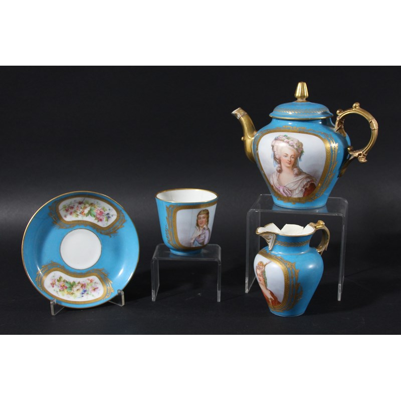 SEVRES STYLE BREAKFAST SET, mid 19th century, painted with portraits on a bleu celeste ground, interlinked Ls mark, height of teapot 13cm