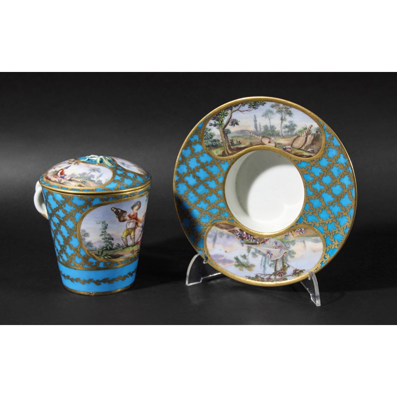 SEVRES CHOCOLATE CUP, COVER AND TREMBLEUSE SAUCER,