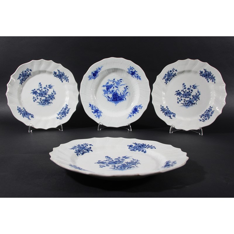 circa 1770-80, blue painted with a chinoiserie floral scene inside an ozier moulded border, blue artists mark 2, diameter 24cm; together with a set of three Tournai plates, blue printed with a chinoiserie scene inside ozier border, diameter 24cm (4)