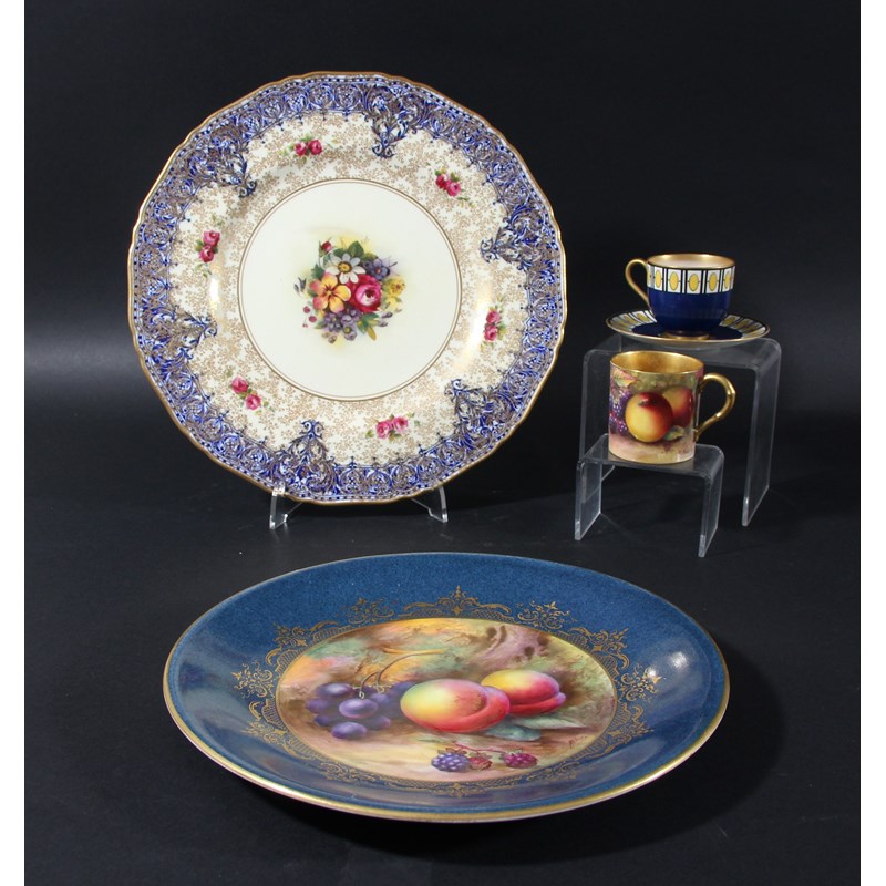signed HH Price, painted with fruit inside a powder blue and gilt ground, puce mark, diameter 24cm; another cabinet plate painted with flowers inside a gilt and underglaze blue border, diameter 26.5cm; a coffee can signed Moseley and another cup and saucer (4)
