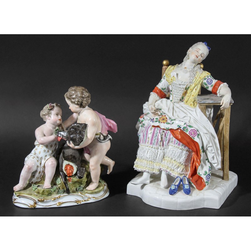 a Meissen figure of a lady asleep in a chair, the letter slipped into her bodice, blue crossed swords marks, incised E58, height 19cm; and a Meissen Marcolini group, of two classical young hunters holding the head of a boar, blue crossed sword and star mark, incised B87, height 14cm (2)