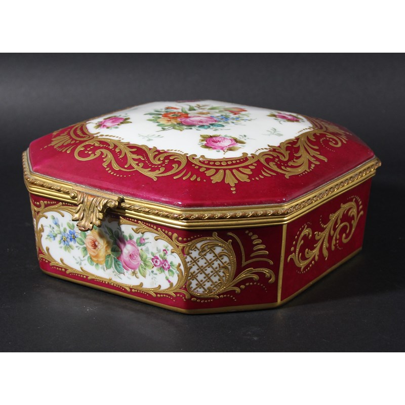 SEVRES STYLE CASKET, late 19th century, painted with floral sprays inside gilt frames on a maroon ground, blue interlinked L's mark, width 21cm