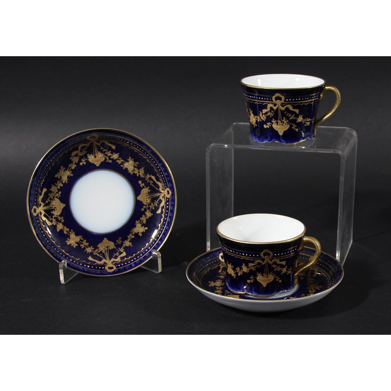 Gardner Factory, with gilt floral swags on a dark blue ground, iron red printed marks, diameter of saucer 11.5cm (2)