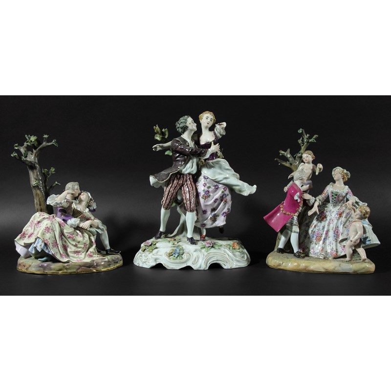 late 19th or 20th century, modelled as a courting couple beneath a tree, blue crossed sword and incised 612, height 19cm; another Meissen group of a couple and two cherubs around a tree, blue crossed swords and incised 831, height 20cm; and a Continental group of a courting couple (3)