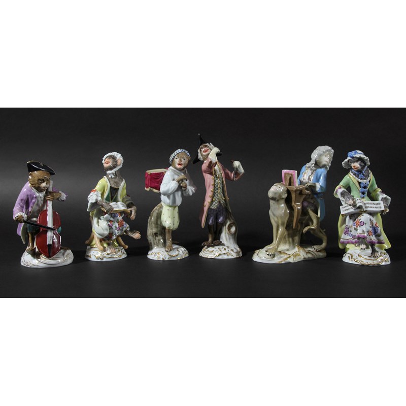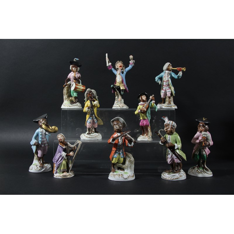 late 19th and 20th century, the Meissen figures to include a conductor, two singers, a drummer and a keyboardist astride a monkey, various blue factory marks (16)