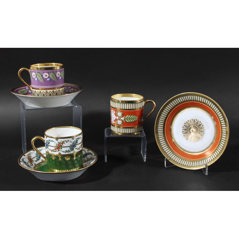 19th century, Empire style, each with a different style of painted or gilded decoration including neoclassical, floral and fruit, blue printed factory mark, various incised and painted marks, diameter of saucers 13.5cm, height of cans 6cm (23)