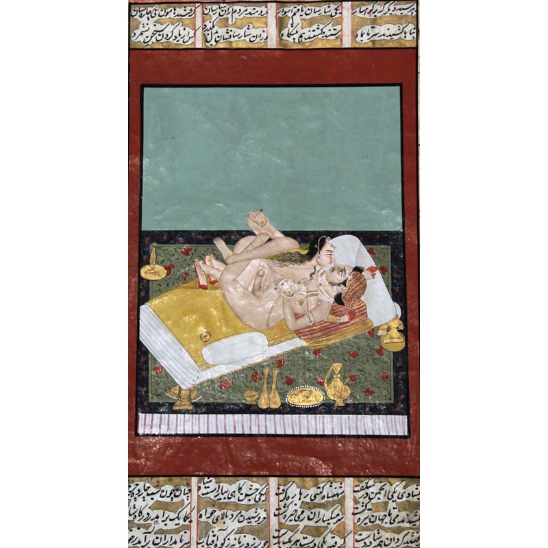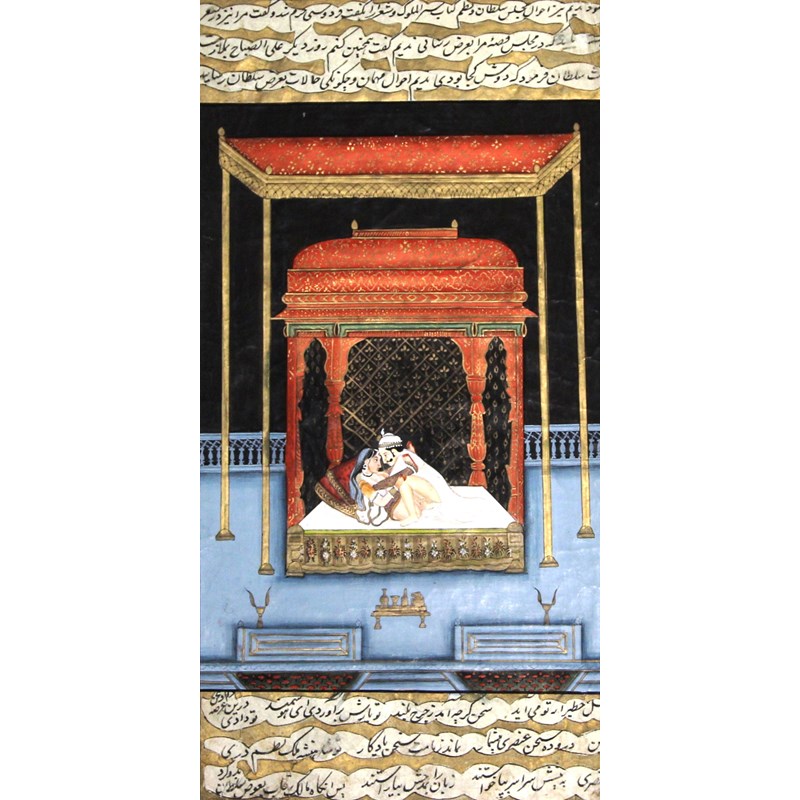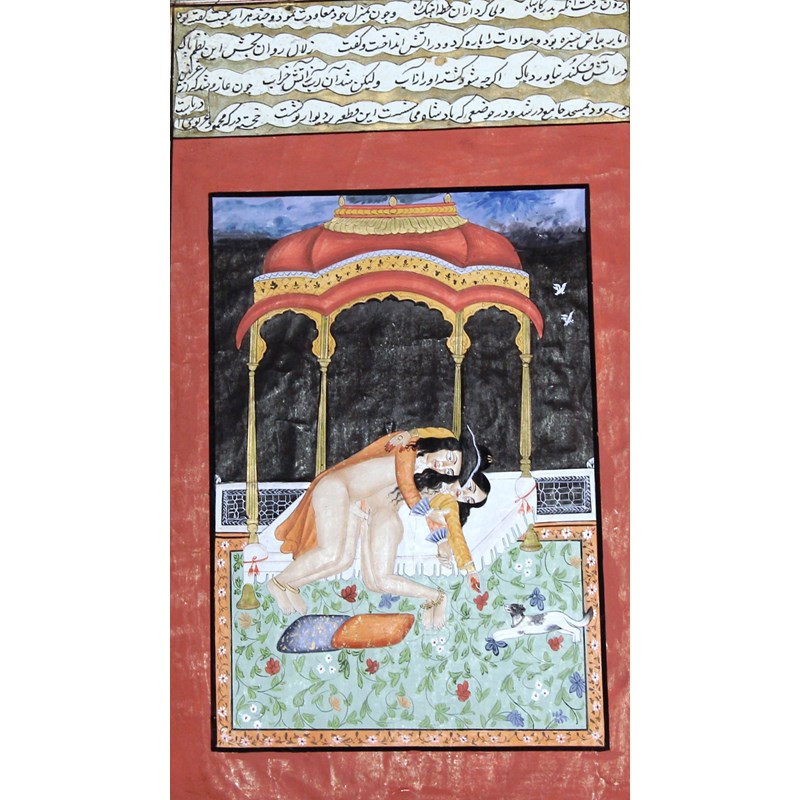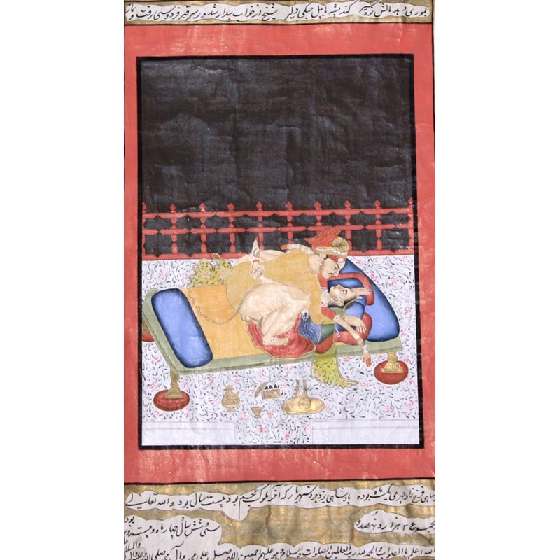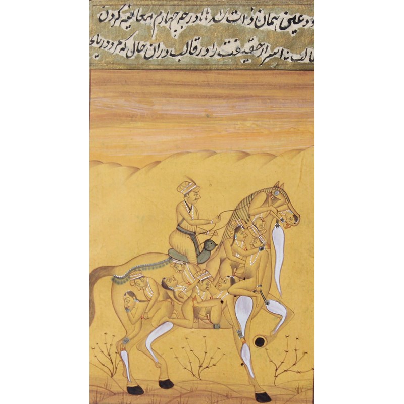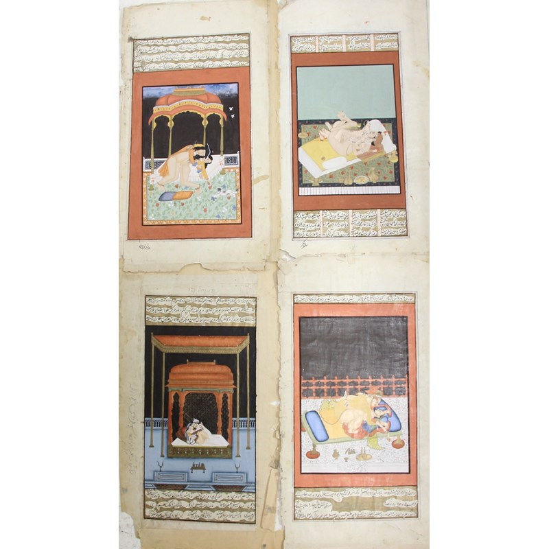Set of four miniatures each depicting a couple in a romantic embrace, 18th or 19th century, ink, gouache and gilding with a hand written inscription verso, image size 32cm x 18cm; and another of a composite horse and rider with various erotic scenes, inscription verso, 16.5cm x 9.5cm (5)