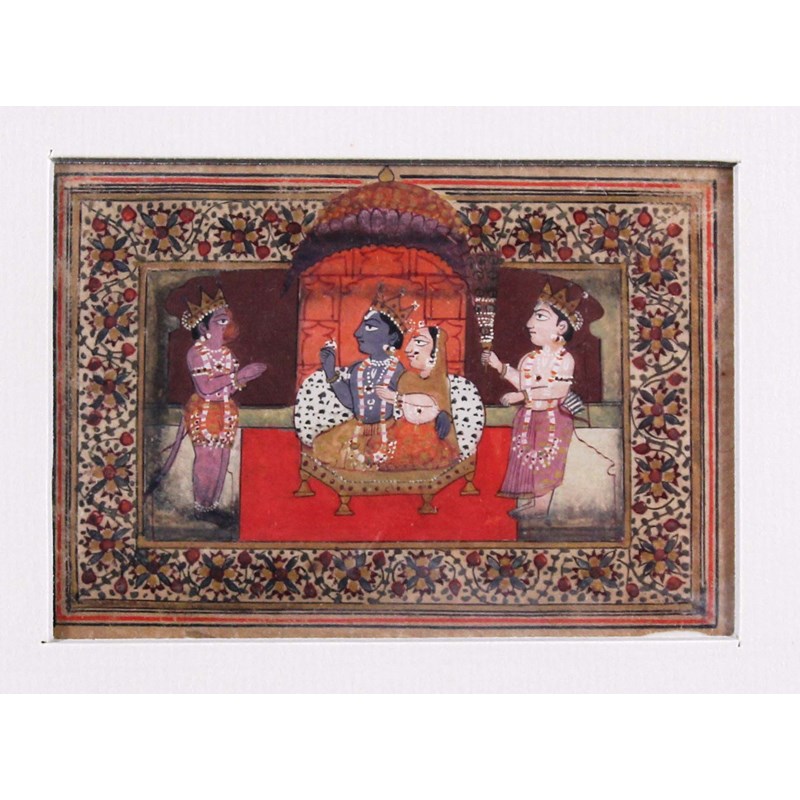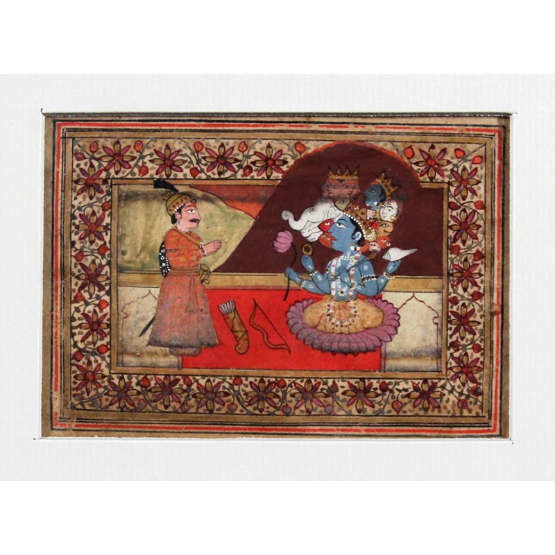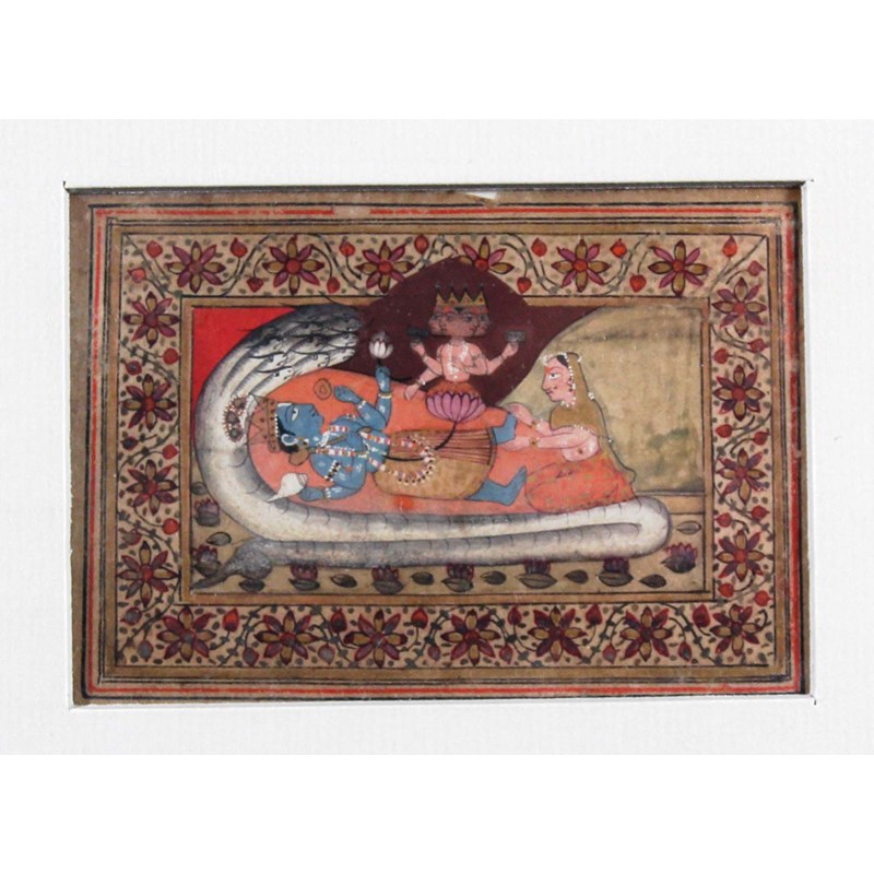 A set of six miniatures depicting Indian life and the life of Vishnu variously depicted with four arms, holding a conch, a lotus flower and reclining in the coils of the serpent Shesha, 19th century or possibly earlier, watercolour and gouache, 6.5cm x 10cm (6)