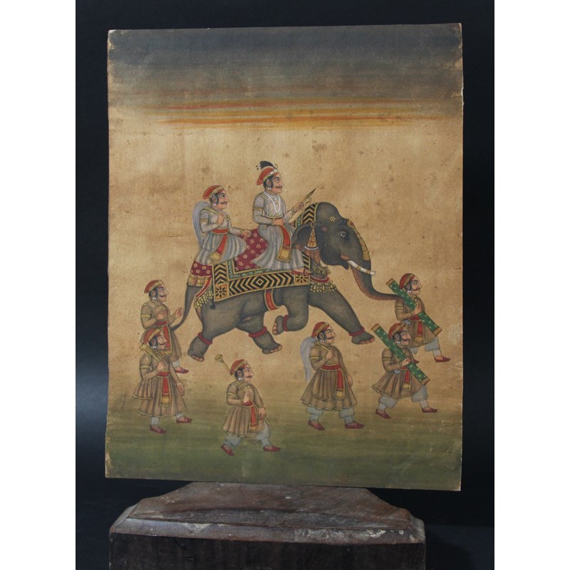 A procession with two men on an elephant and six others walking, probably Punjab, watercolour and gouache with gilt highlights, 31cm x 24cm