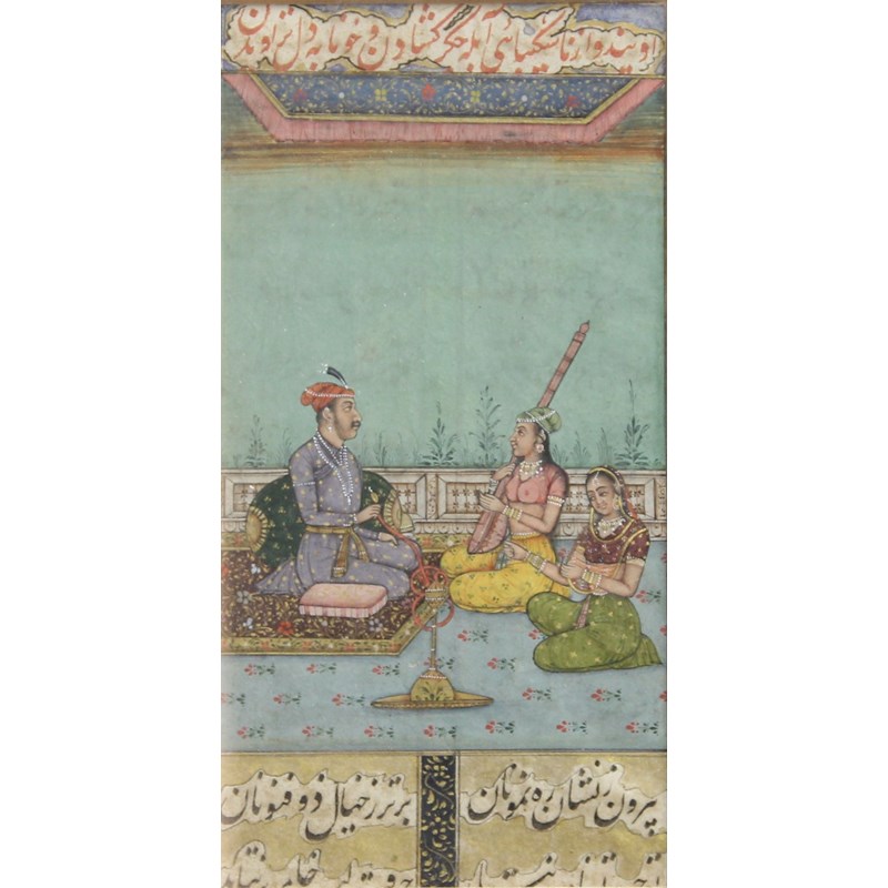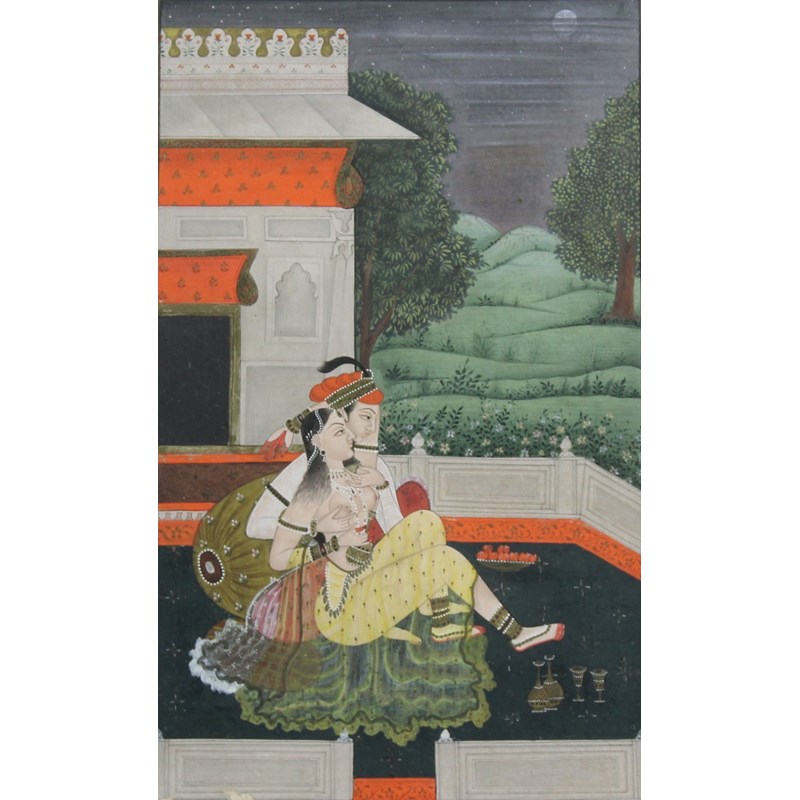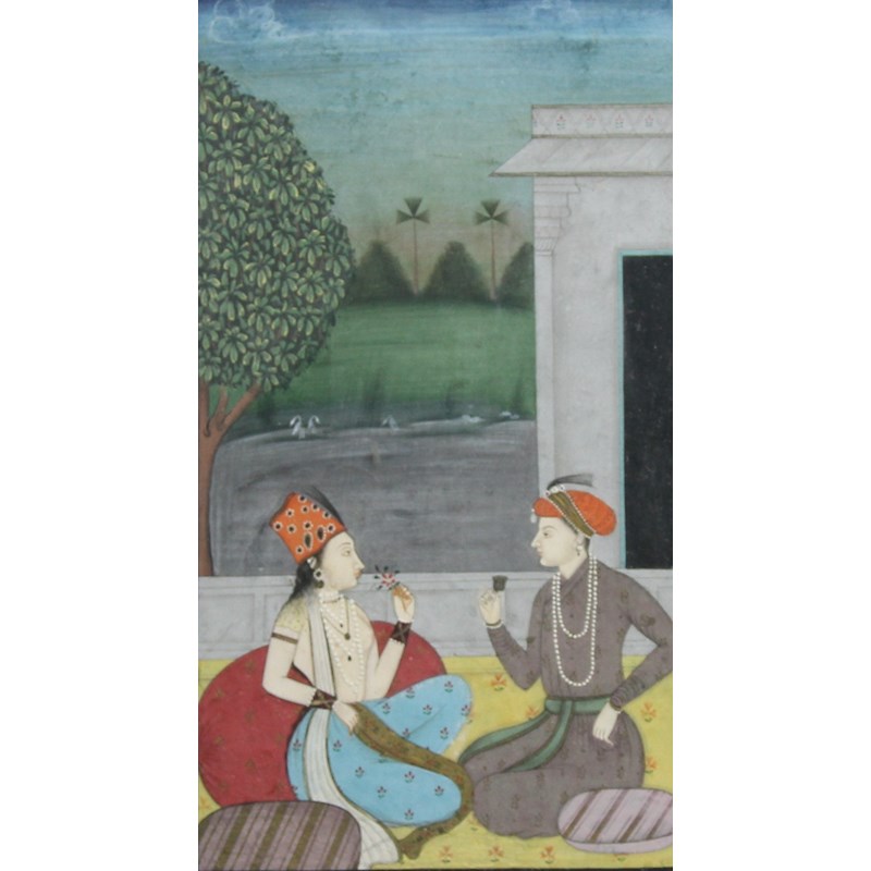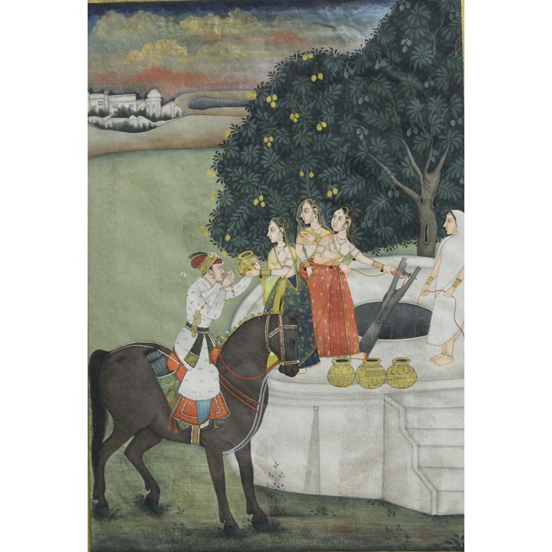 Miniature of a Prince on horseback receiving a drink from a well, probably Punjab, gouache and gilt, 23cm x 16cm; together with three other miniatures including one mildly erotic, 20cm x 13cm and smaller (4)