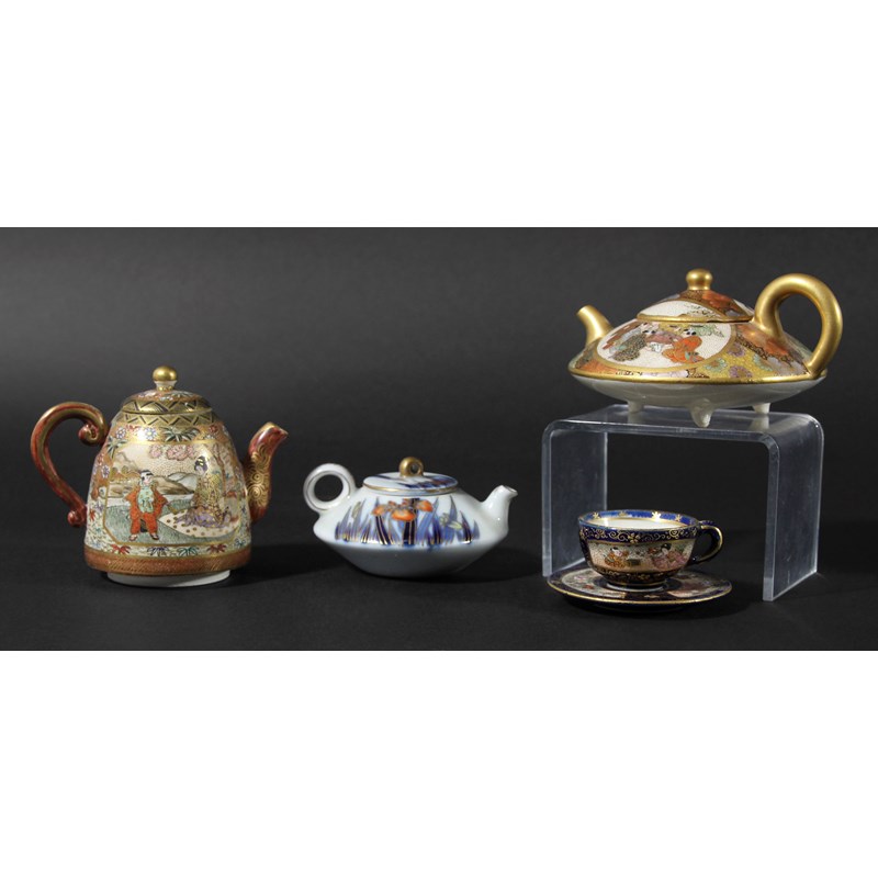 of domed form, with two figural scenes, signature to base, height 7cm; together with another of flattened ovoid form, with two shaped figural panels, signature, width 9cm; a miniature teacup and saucer; and a Fukagawa teapot and cover, width 7cm (4)