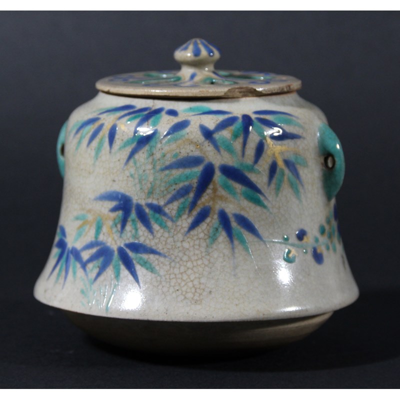 JAPANESE STONEWARE BRULE PARFUM AND COVER, Kyoto, painted with bamboo on a pale grey/celadon ground, height 9.5cm