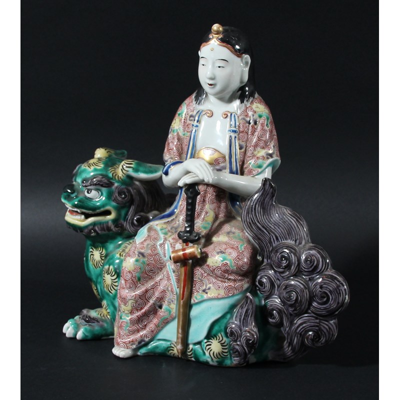 JAPANESE KUTANI FIGURE OF GUANYIN, seated on a guardian lion, height 25cm