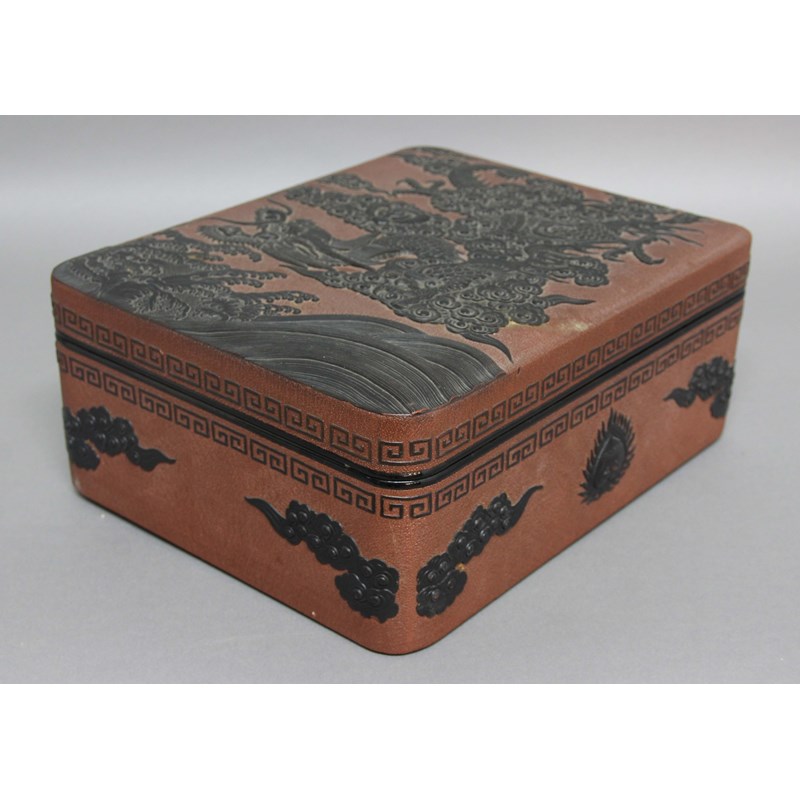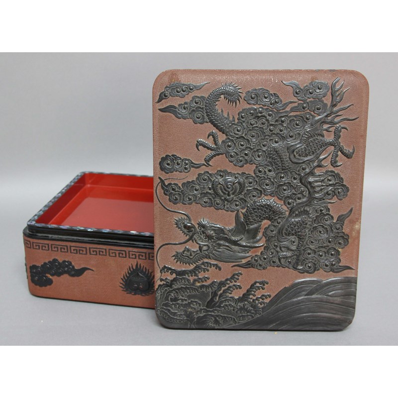 20th century, by Shikki Co, Okinawa, of rectangular form, the cover with a scrolling dragon in clouds above waves, with a lift out tray, gilt marks, height 12cm, width 23cm, depth 29cm