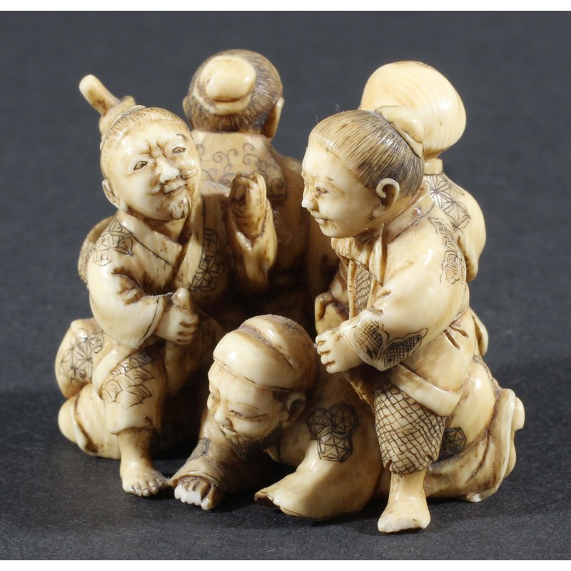 JAPANESE IVORY OKIMONO, modelled as a group of six men and boys, width 4cm