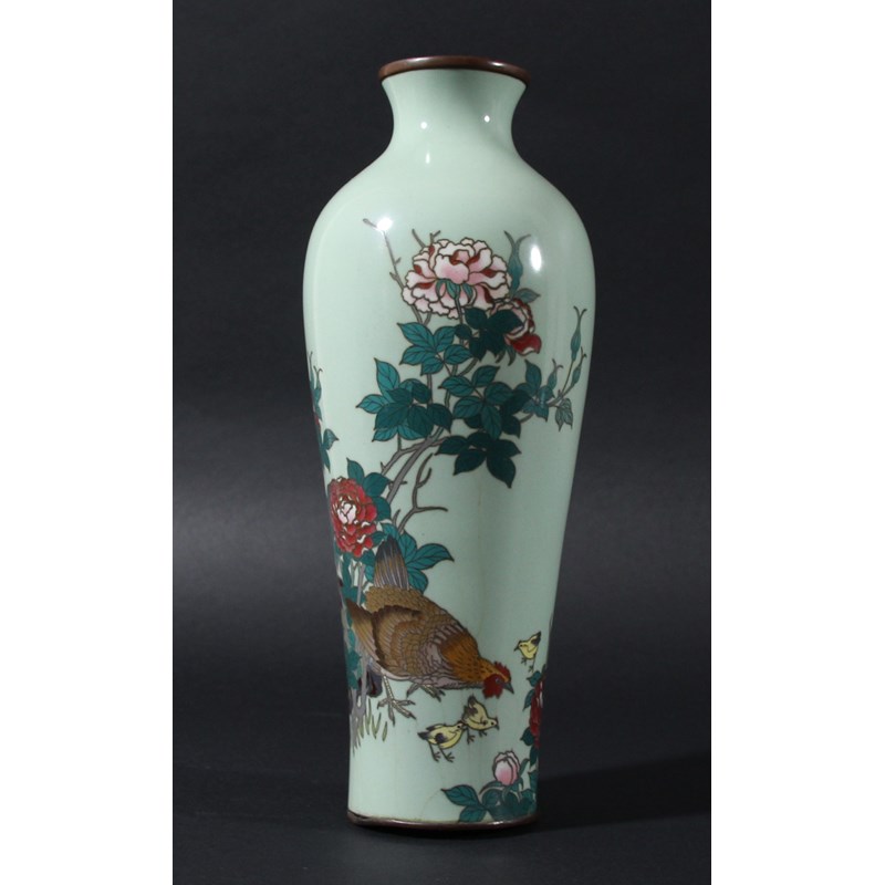 JAPANESE CLOISONNE VASE, of shouldered form, decorated with a hen and chicks before flowers on a celadon ground, height 25.5cm
