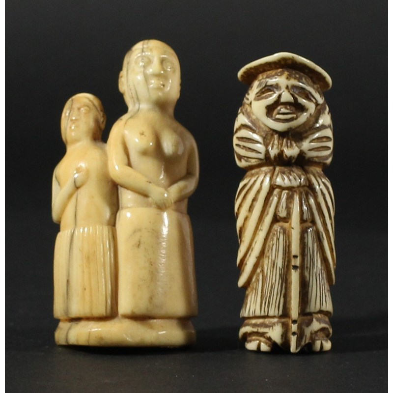 POLYNESIAN MARINE IVORY CARVING OF TWO MEN IN SARONGS, perhaps Tahitian, 19th century, height 7cm; together with a Japanese bone netsuke of a man wearing hat and cloak, height 6.5cm (2)
