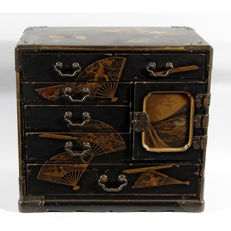 late 19th century, with an arrangement of six drawers and a cupboard enclosing two further drawers, in black lacquer with gilt fan decoration and metal mounted corners, the cupboard decorated with a fine view of Mount Fuji, height 17cm, width 19cm, depth 12cm