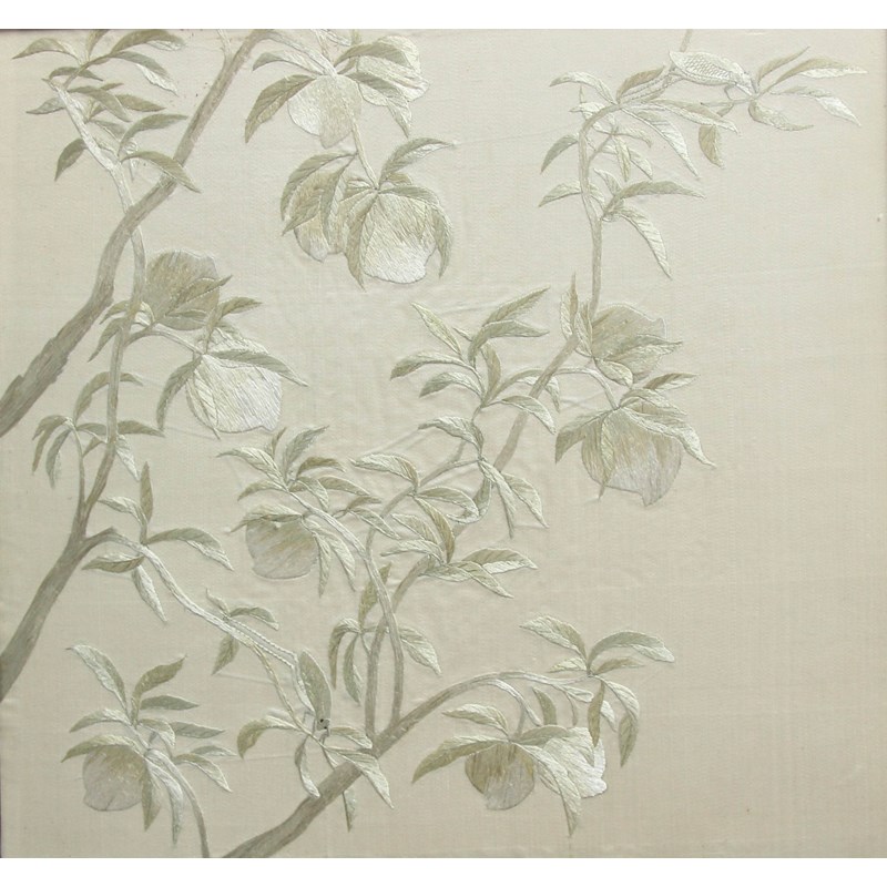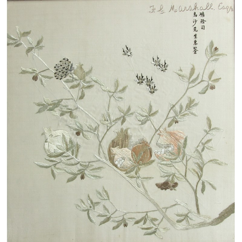 worked in pale colours on a cream silk ground, depicting a parrot amongst lichee, bees around pomegranate, peaches and bees amongst fruit, some with inscriptions, each panel 35cm x 37cm approx (4)
