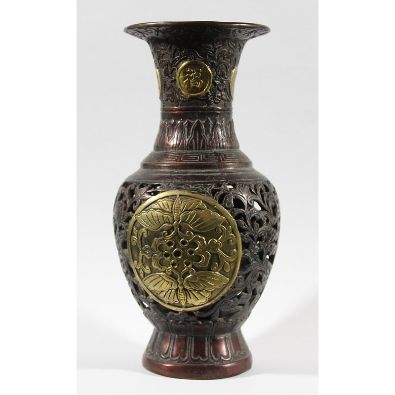 CHINESE BRONZE VASE, 19th century, of pierced, baluster form, brown patinated with unpatinated butterfly panels, four character Xuande mark, height 19.5cm