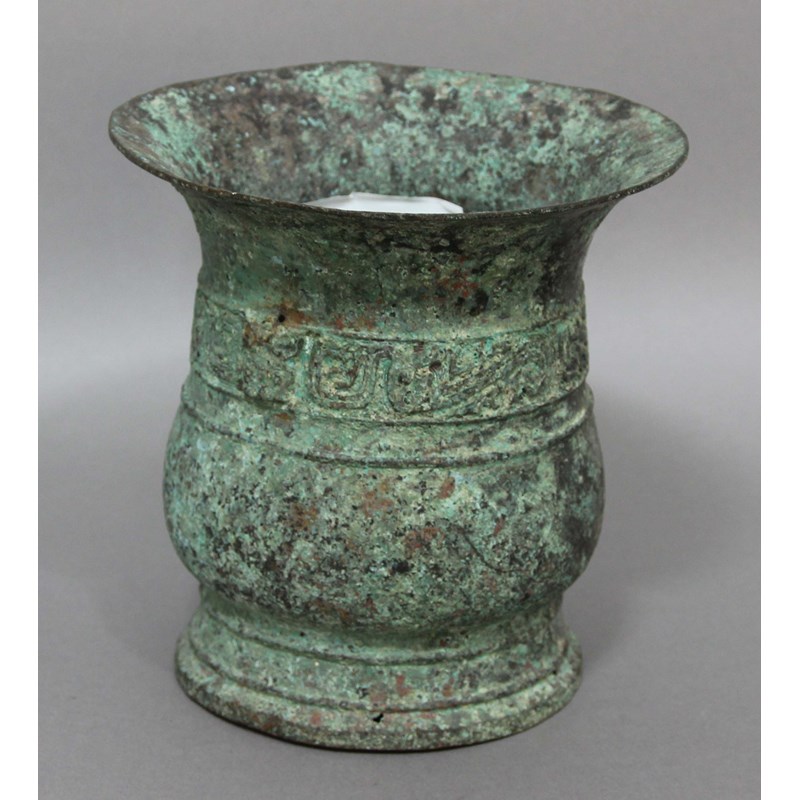 CHINESE ARCHAISTIC BRONZE VESSEL, Zhou style, of swollen baluster form with a band of scrolling decoration beneath a flaring rim, height 16cm