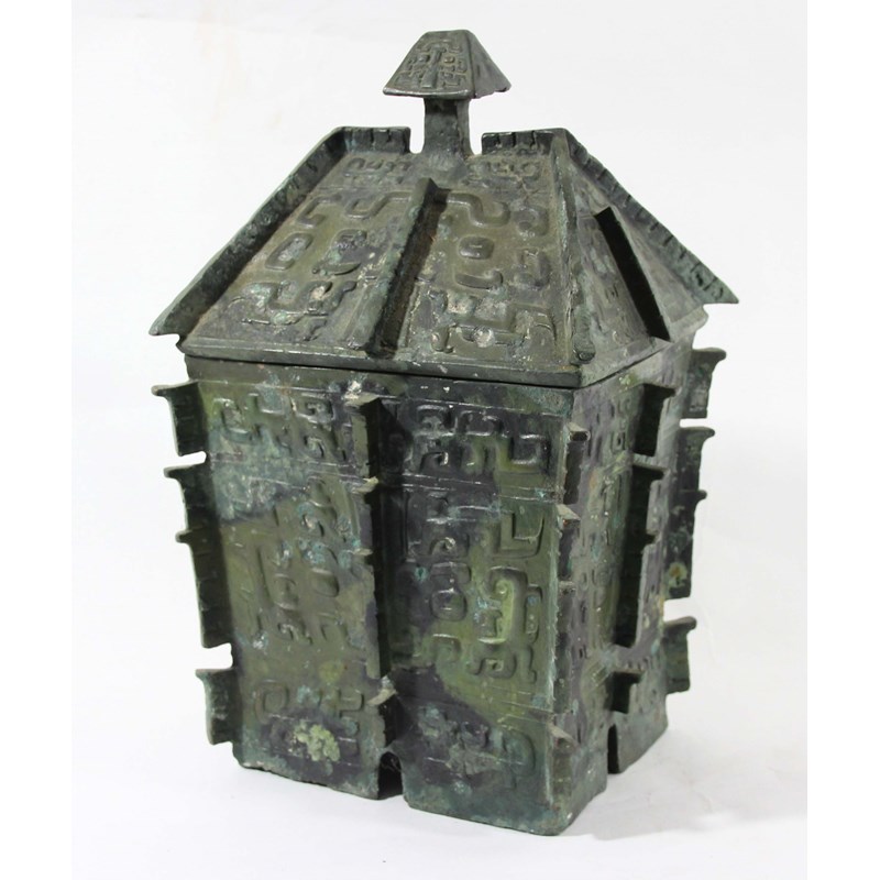 CHINESE BRONZE BOX AND COVER, of fang ding style, with winged and scrolling archaistic style decoration in relief, height 30cm, width 18cm, depth 15cm