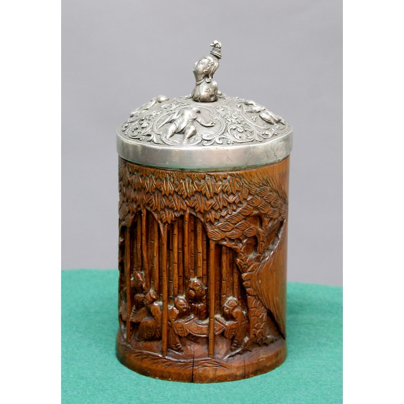 bitong, late 19th century, the pot carved with scholars amongst trees, the cover with four figures in relief inside scrolling cartouches beneath a central female bust finial, height 23cm
