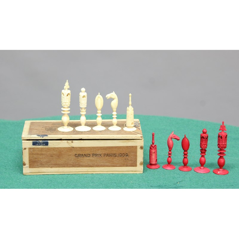 early 20th century, natural and red stained, and two matching shakers; together with an ivory chess set, possibly Burmese, natural and red stained, height of kings 8cm, height of pawns 4cm (two sets)