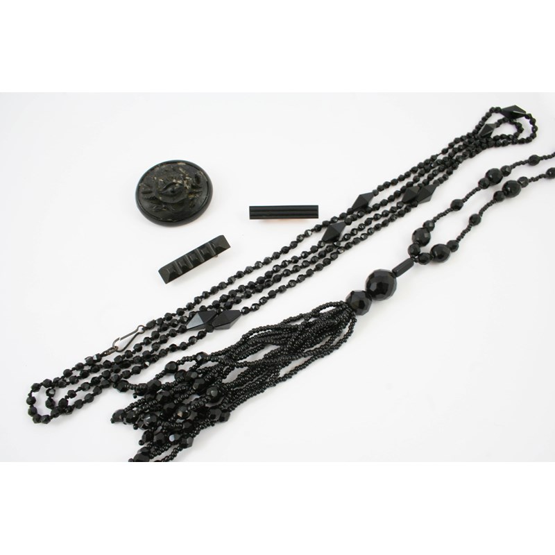 A QUANTITY OF JET JEWELLERY including a long tassel necklace, another necklace etc
