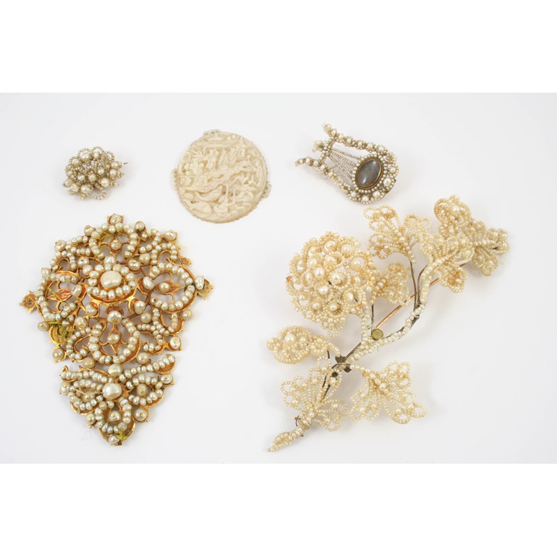 A VICTORIAN SEED PEARL FOLIATE BROOCH together with various other seed pearl brooches and a carved section of mother of pearl