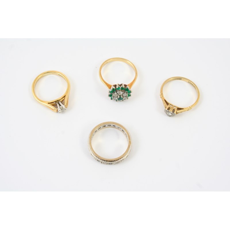 set with a circular-cut diamond in 18ct gold, size I, a diamond solitaire ring, the circular-cut diamond is set in a heart-shaped setting, in 18ct gold and platinum, size L 1/2, an emerald and diamond cluster ring, set in 18ct gold, size L, and a gem set eternity ring, size L 1/2