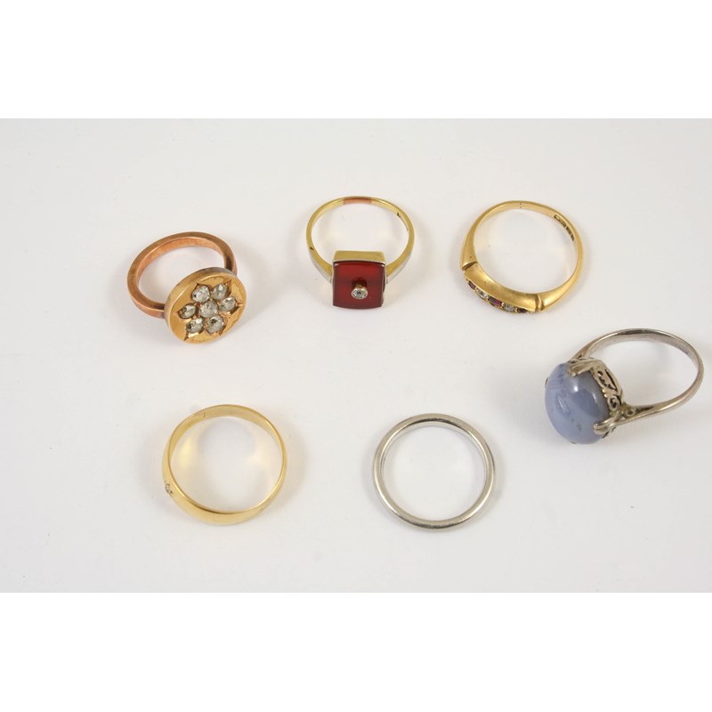 set with three circular-cut rubies and two circular-cut diamonds in 18ct gold, size M 1/2, together with a diamond cluster ring, set with seven old cushion-shaped diamonds, in yellow gold, size G, an 18ct gold band mounted with a small diamond, size N, a carnelian and yellow gold ring mounted with a small diamond, size K 1/2, a platinum wedding band, 4.1 grams, size J, and another ring