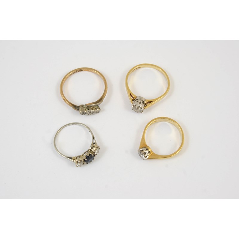 set with a circular-cut diamond in 18ct yellow gold, size Q, a diamond solitaire ring, set with a circular-cut diamond in 18ct yellow gold, size K, a diamond cross-over three stone ring, set with three small diamonds in yellow gold and platinum, size R 1/2 and a sapphire and diamond three stone ring, set with a circular-cut sapphire and two circular-cut diamonds in platinum, size K