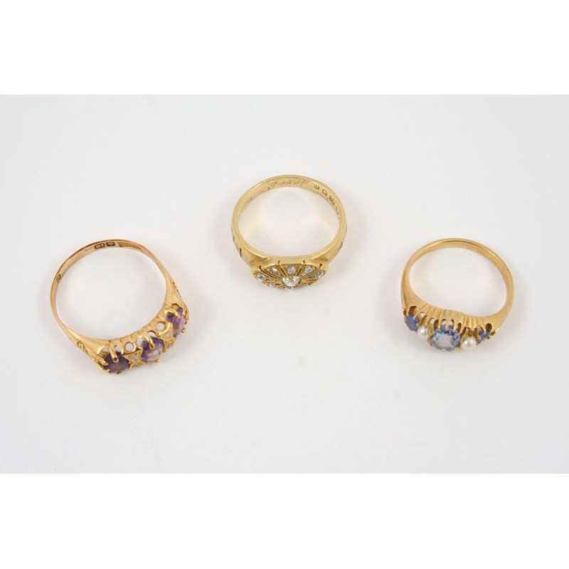 mounted with old brilliant-cut diamonds and inscribed inside Jane E Wheeler died 1st March 1868, size P 1/2, together with an amethyst and diamond ring, set in 18ct gold, size T and a pearl and gem set ring, set in gold, size M 1/2