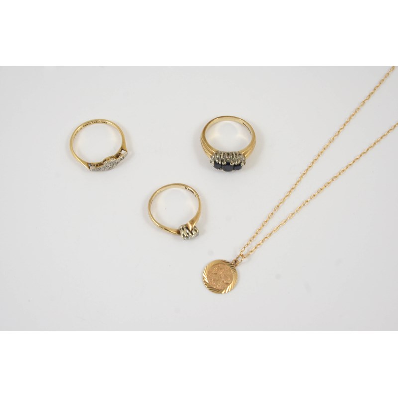 set with two circular-cut diamonds, in yellow gold, size J, a diamond ring, set in 18ct yellow gold and platinum, size M, a sapphire and diamond triple cluster ring, set in yellow gold, size J 1/2, and a 9ct gold St. Christopher pendant on a chain, 1.6 grams