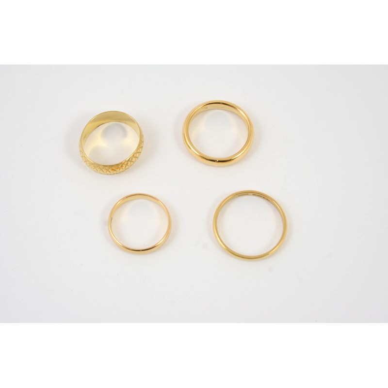 A 22CT GOLD WEDDING BAND with engraved decoration, 5.2 grams, size K 1/2, together with three plain 22ct wedding bands, 13.2 grams