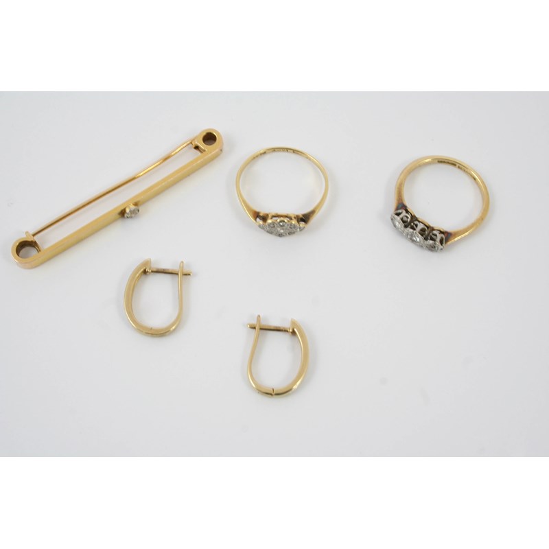 the three circular-cut diamonds are set in 18ct yellow gold and platinum, size L 1/2, a diamond cluster ring, set in 18ct yellow gold and platinum, size N, a pair of diamond and yellow gold half hoop earrings and a yellow gold bar brooch centred with a circular-cut diamond, 5cm long