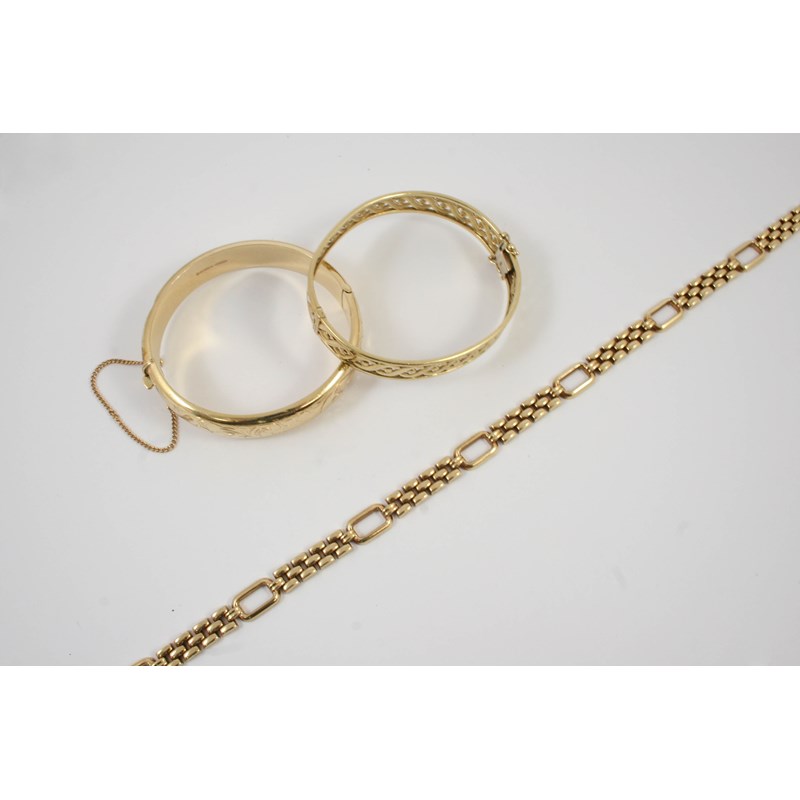41.5cm long, 26 grams, together with a 9ct. gold openwork hinged bangle, 19.7 grams, and a 9ct gold foliate engraved half hinged bangle, 17.9 grams