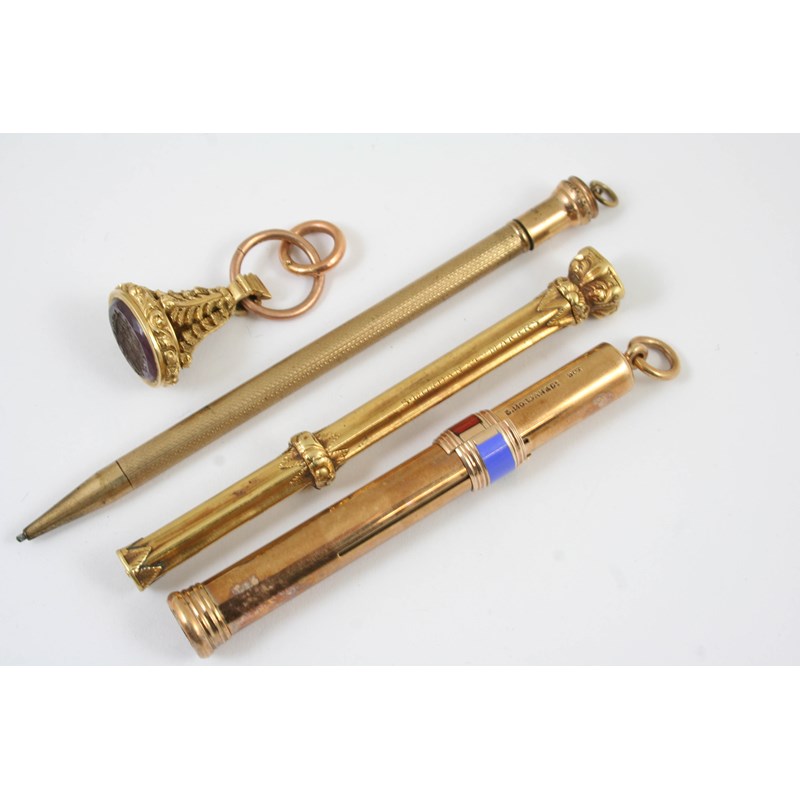 formed with three sliding pencils for black, blue and red, 8cm long, together with another gold propelling pencil by S. Mordan & Co, with a bloodstone terminal, 9.2cm long, a rolled gold propelling pencil and a gold seal, with an amethyst matrix engraved with a coat of arms, 2.8cm high