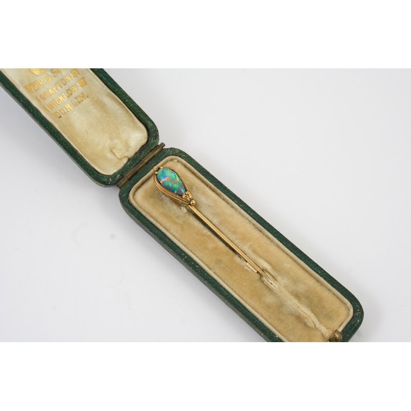 A BLACK OPAL AND GOLD STICK PIN set with a pear-shaped solid black opal in an ornate gold mount