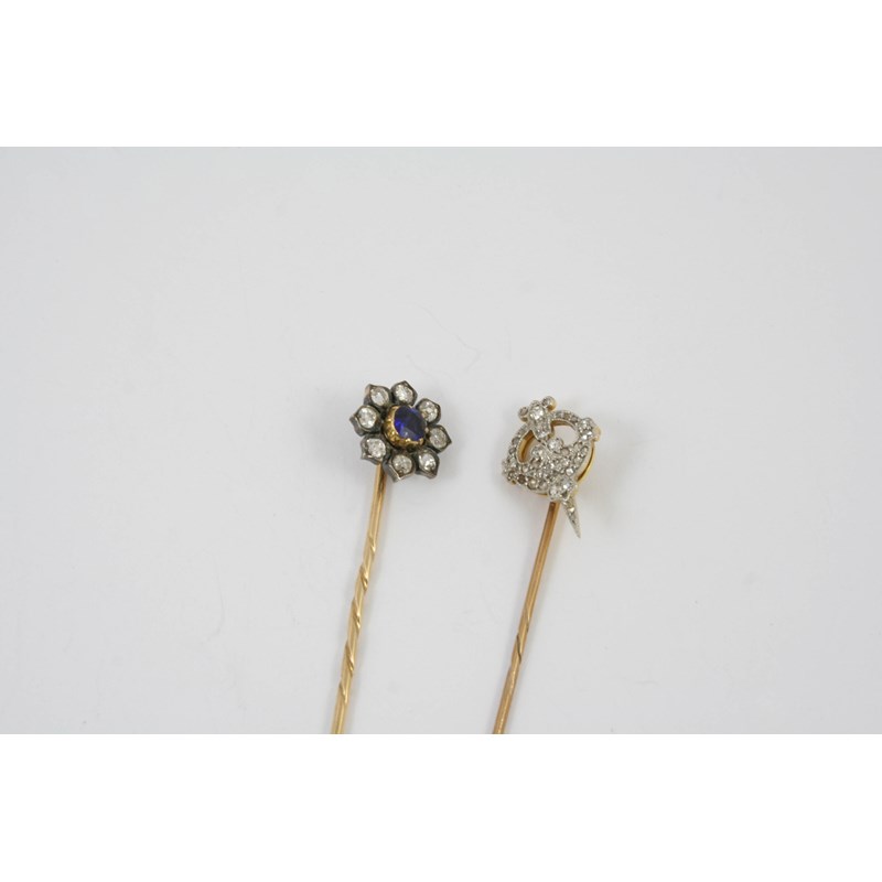 the flowerhead is centred with a circular sapphire within a surround of old brilliant-cut diamonds, in silver and gold, together with a Scottish diamond set stick pin