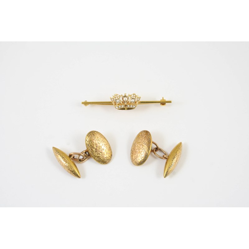 set with graduated half pearls, 5cm long, together with a pair of 15ct gold cufflinks, the oval and torpedo-shaped links with engraved foliate decoration, 8.4 grams