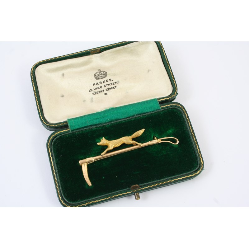 formed with a riding crop and a running fox, 5.5cm long, 7.3 grams, in fitted box by Parkes, 12 Vigo Street, Regent Street, W
