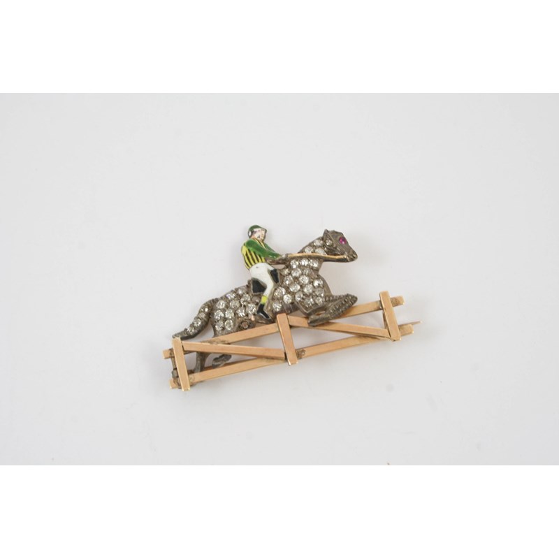 the horse set overall with graduated old cut diamonds, the jockey with green, yellow and white enamel decoration, jumping over a gold fence, 4.5cm wide
