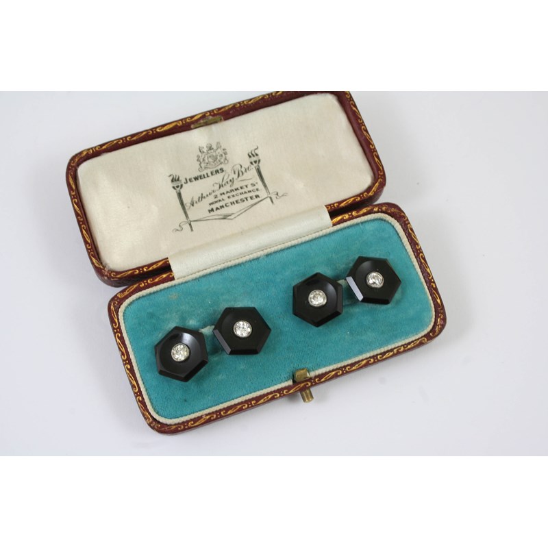 A PAIR OF BLACK ONYX AND DIAMOND CUFFLINKS each hexagonal onyx link is centred with a circular-cut diamond, with French marks, with case