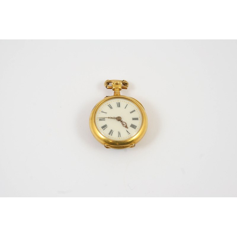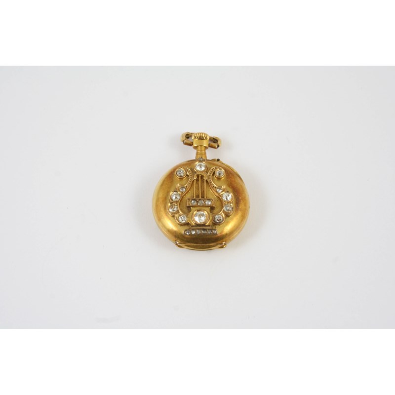 AN 18CT GOLD FOB WATCH the white enamel dial with Roman numerals, the back case with mounted diamond set lyre decoration, 2.5mm diameter, 19.7 grams